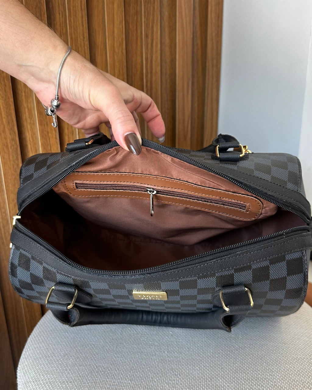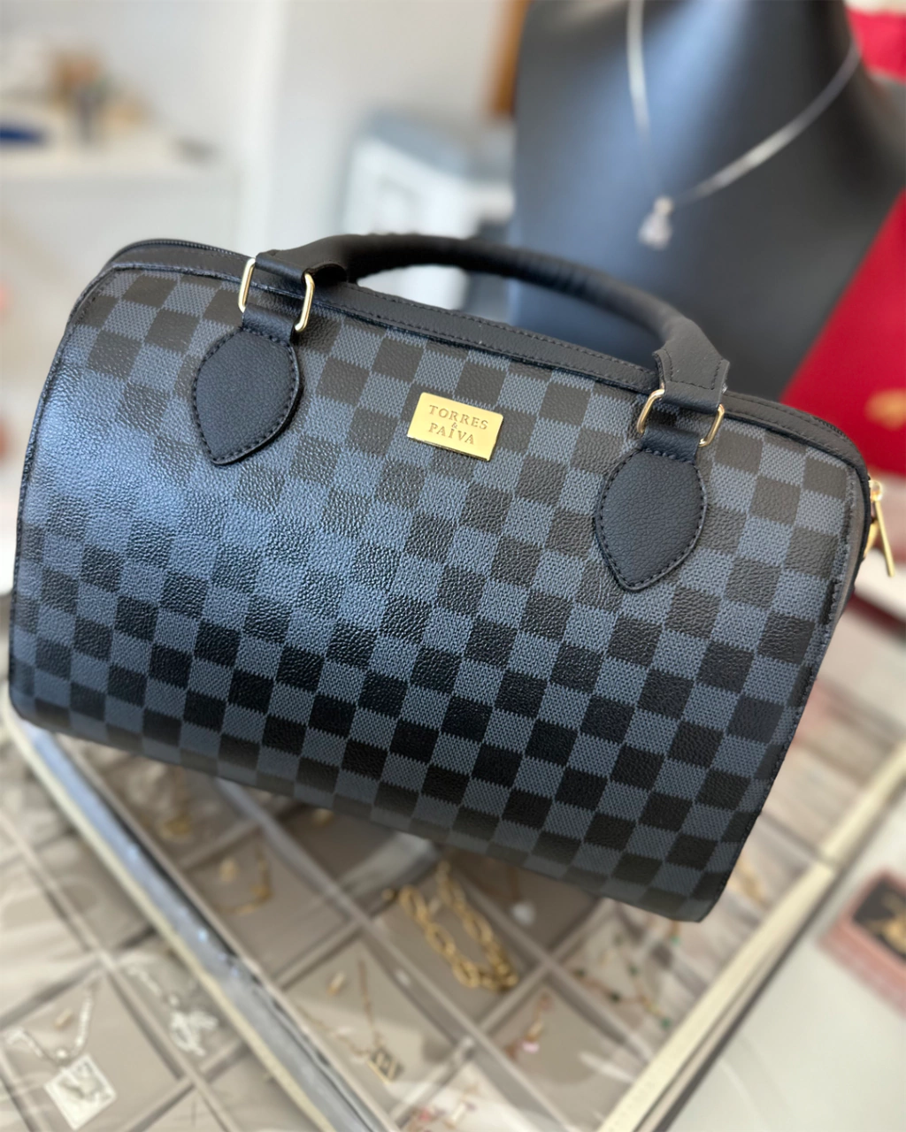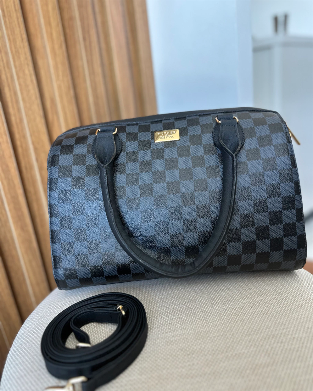 Moderna e sofisticada, a Bolsa Baú Preta com Detalhe Xadrez é perfeita para quem busca um acessório elegante e funcional. Seu design estruturado proporciona um toque clássico, enquanto o detalhe xadrez adiciona charme e personalidade à peça. O interior totalmente forrado garante mais durabilidade e organização, contando com bolso interno e externo para armazenar pequenos objetos com segurança. Acompanha uma alça transversal de 1,40m com regulador, permitindo ajuste para um uso mais confortável e versátil. Ideal para o dia a dia ou ocasiões especiais, essa bolsa une estilo e praticidade em um só acessório!
