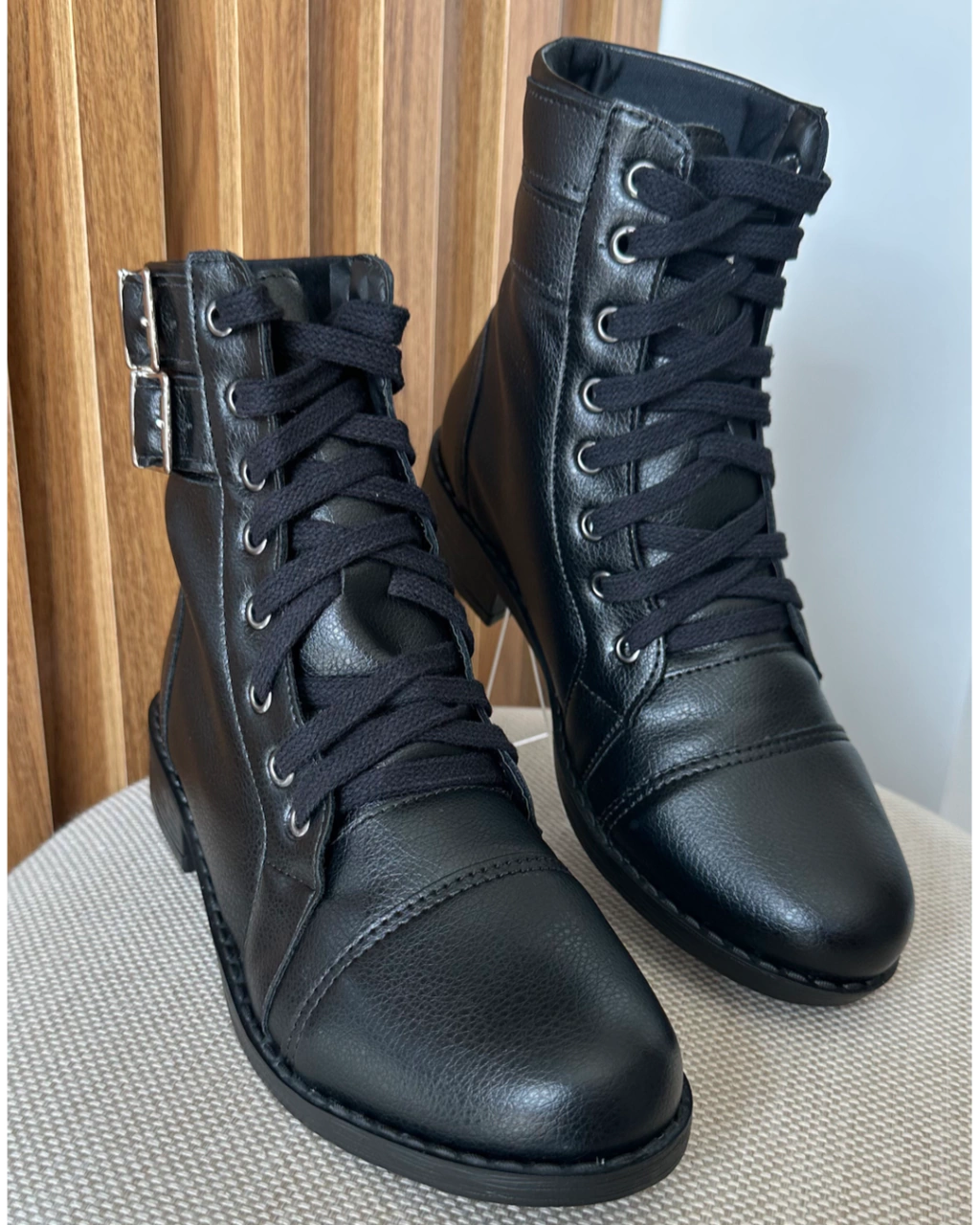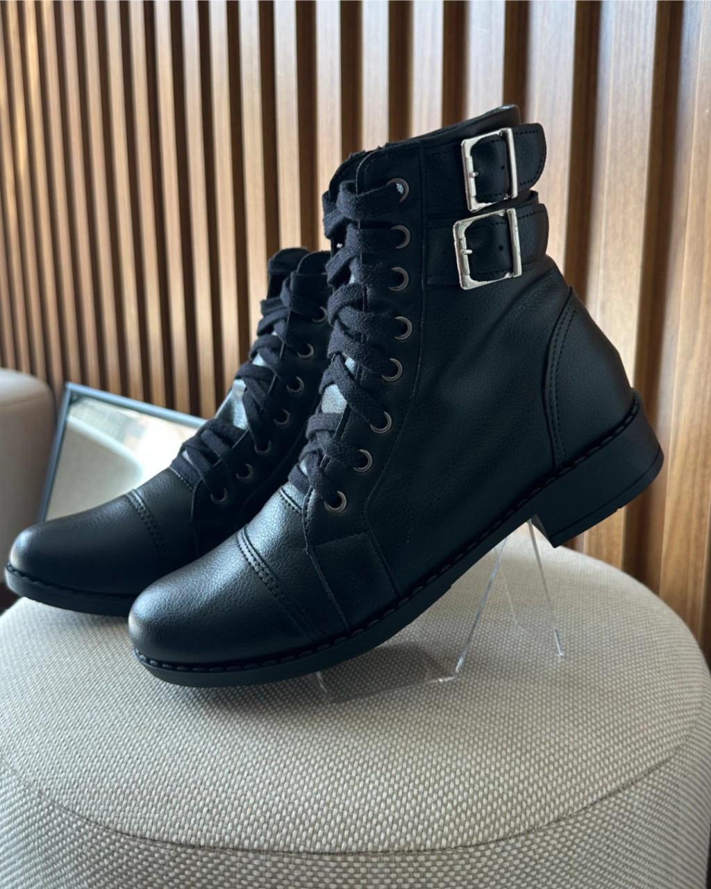 Essa bota coturno é a combinação perfeita de atitude e conforto! Com salto de 3 cm, oferece altura na medida certa para o dia a dia, sem abrir mão da estabilidade. O interior totalmente acolchoado garante sensação de aconchego a cada passo, ideal para longas horas de uso.