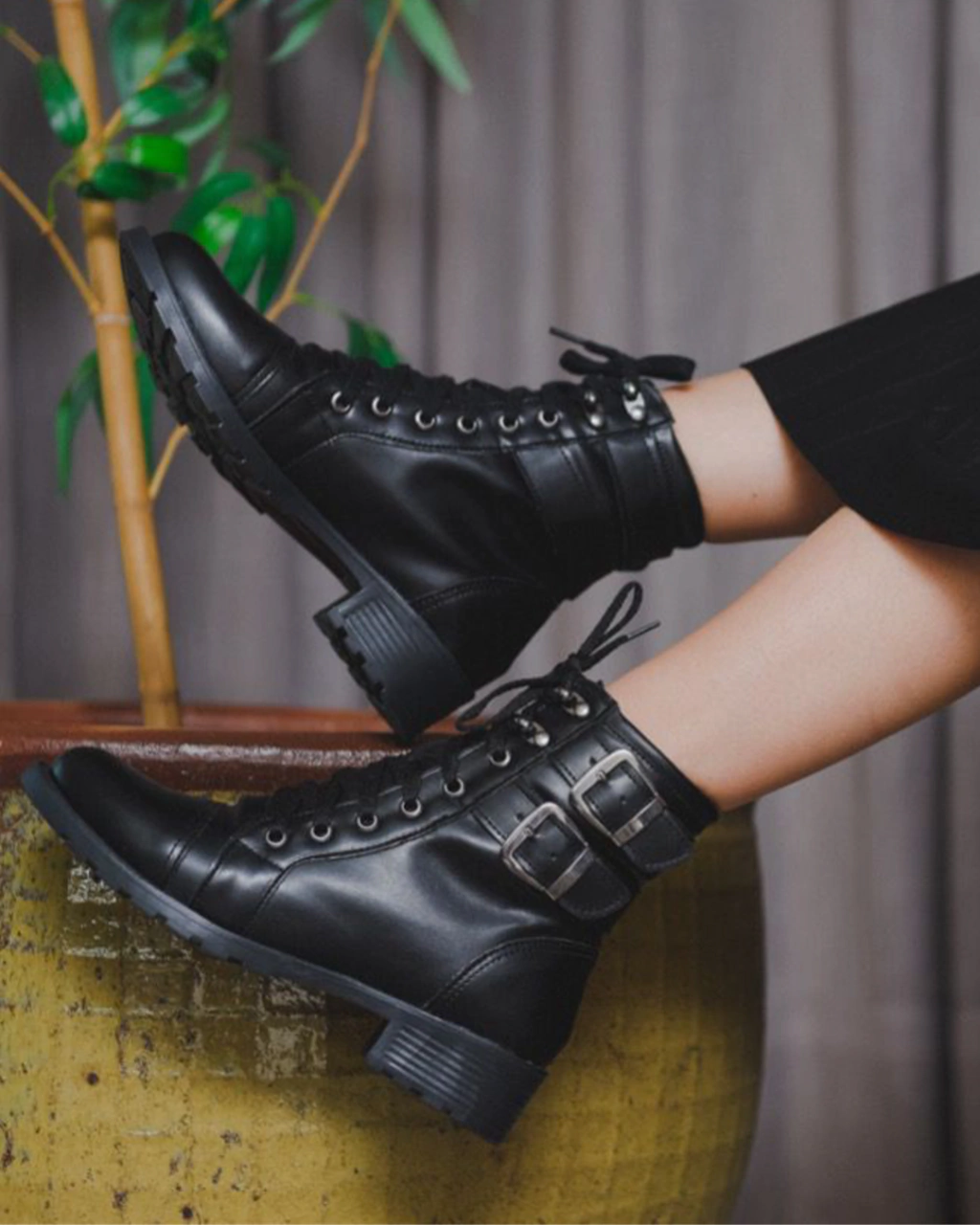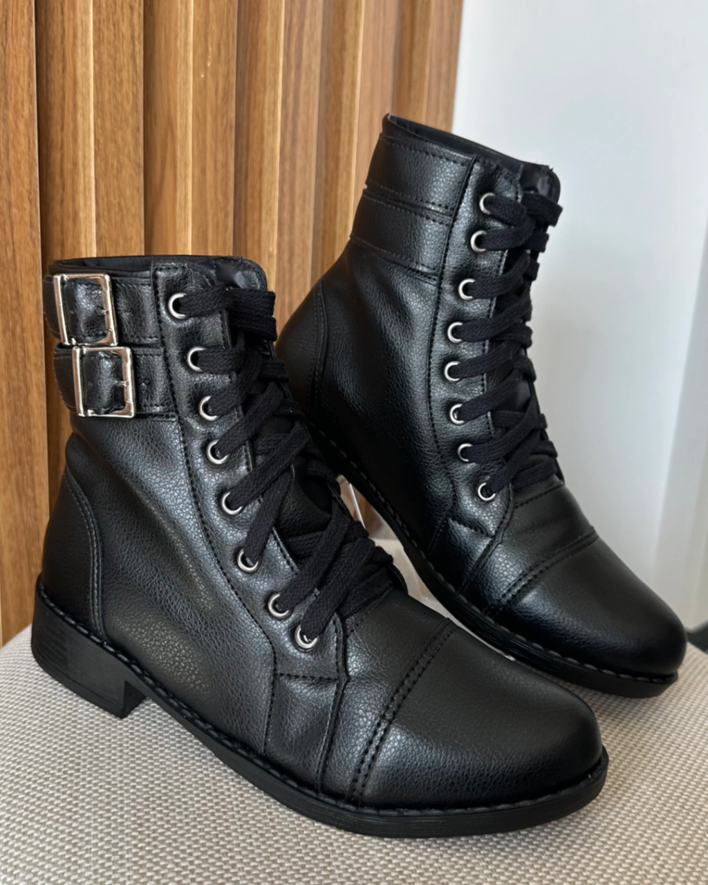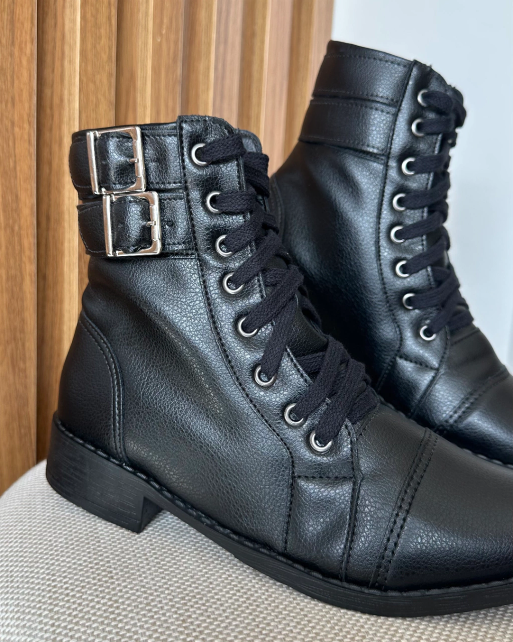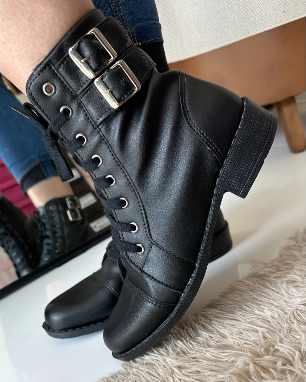 Seu design robusto ganha um toque de estilo com as fivelas laterais e o detalhe em cadarço, que reforçam a pegada urbana e moderna do modelo. Versátil e cheia de personalidade, é a escolha certa para compor looks estilosos em qualquer estação.