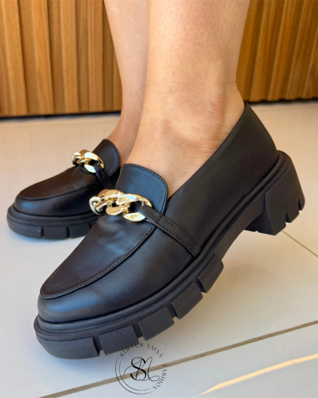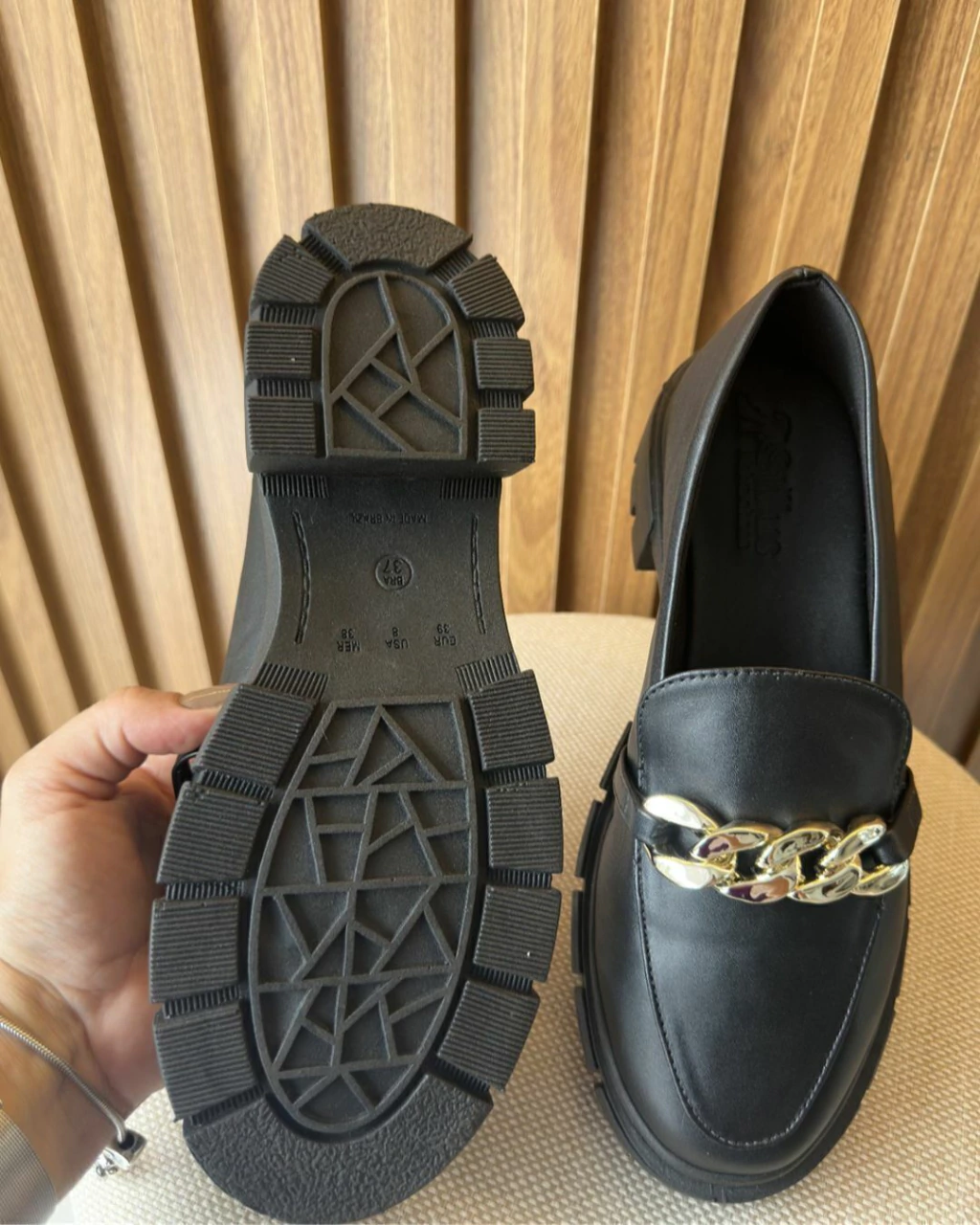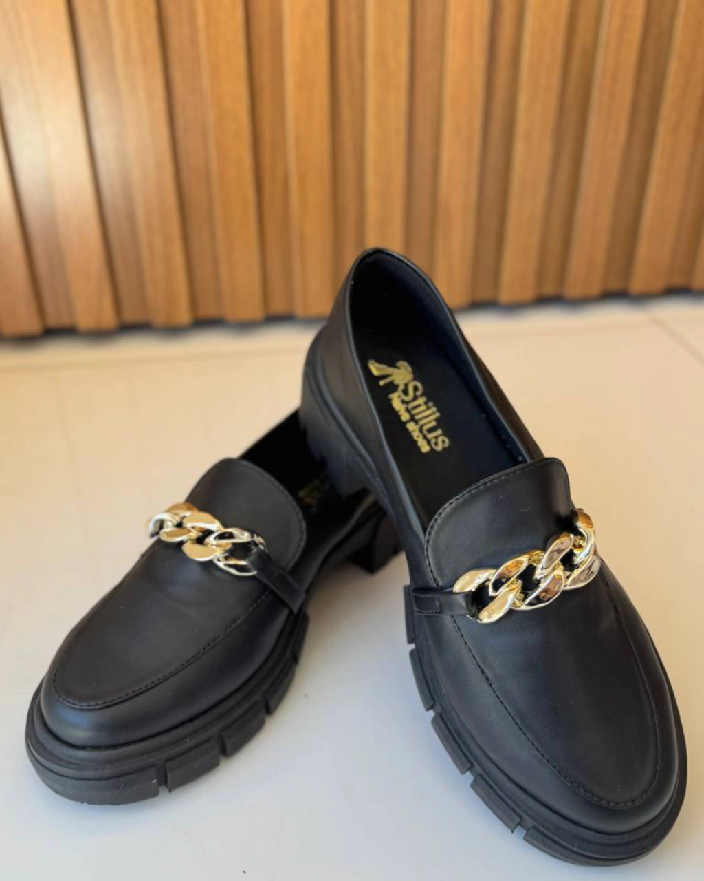 Detalhe do Cadarço Decorativo: Apesar de ser um mocassim sem cadarços funcionais, muitos modelos de mocassim tratorado possuem uma fivela decorativo na parte frontal, que adiciona um toque de estilo e personalidade.