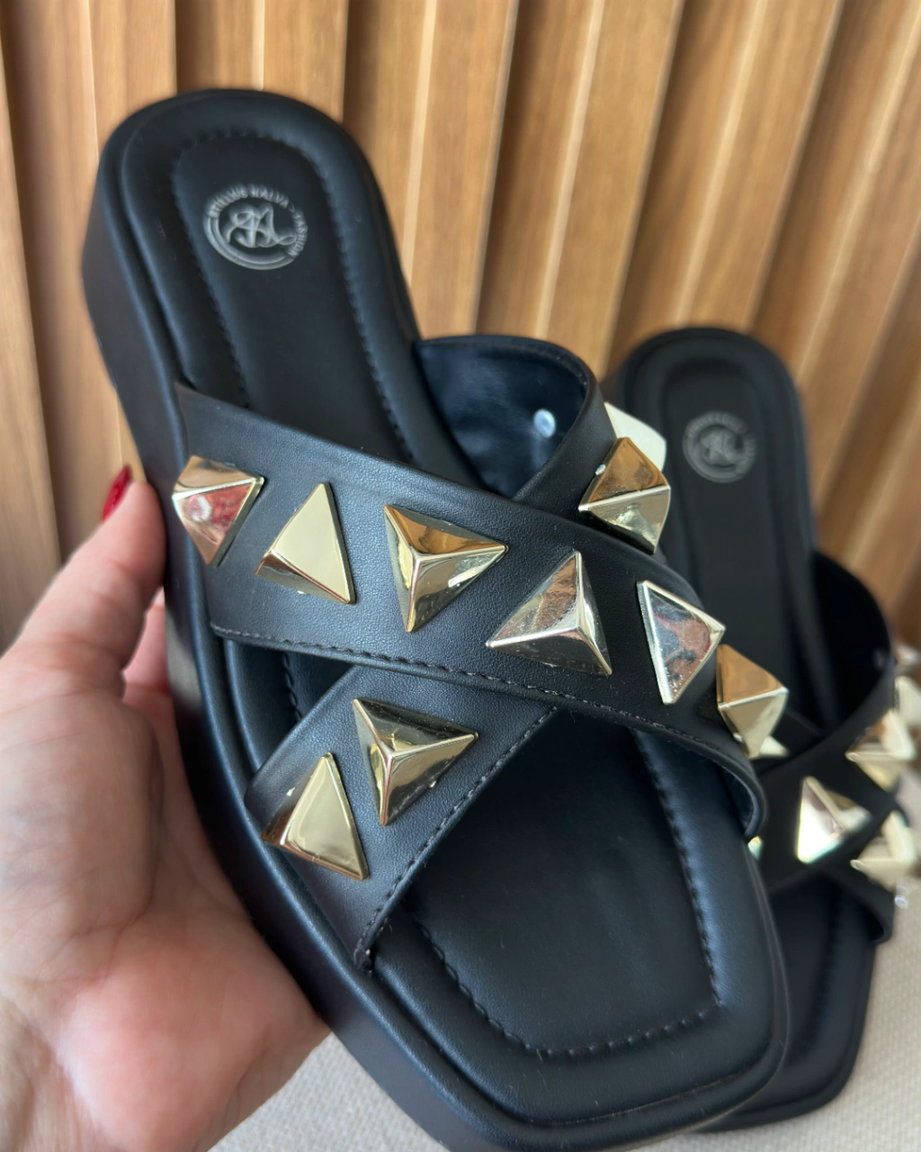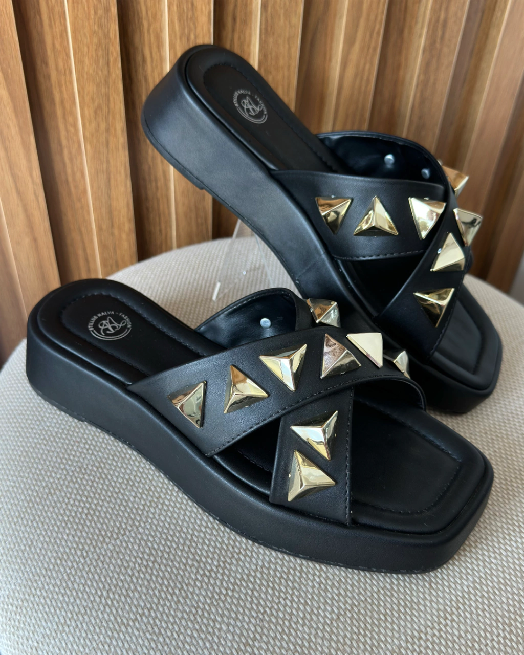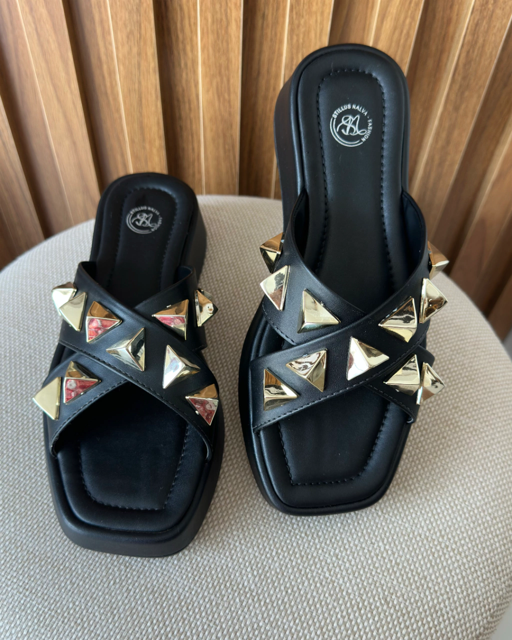 A Papete Flatform Vitória une personalidade, estilo e conforto em um único calçado. Produzida na cor preta, apresenta tiras trançadas com aplicações de tachas triangle douradas, que acrescentam um toque moderno e sofisticado.
