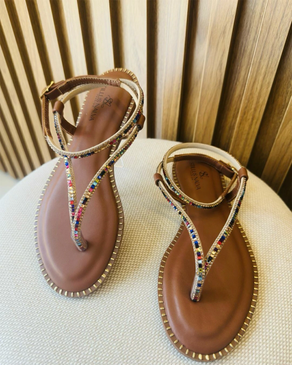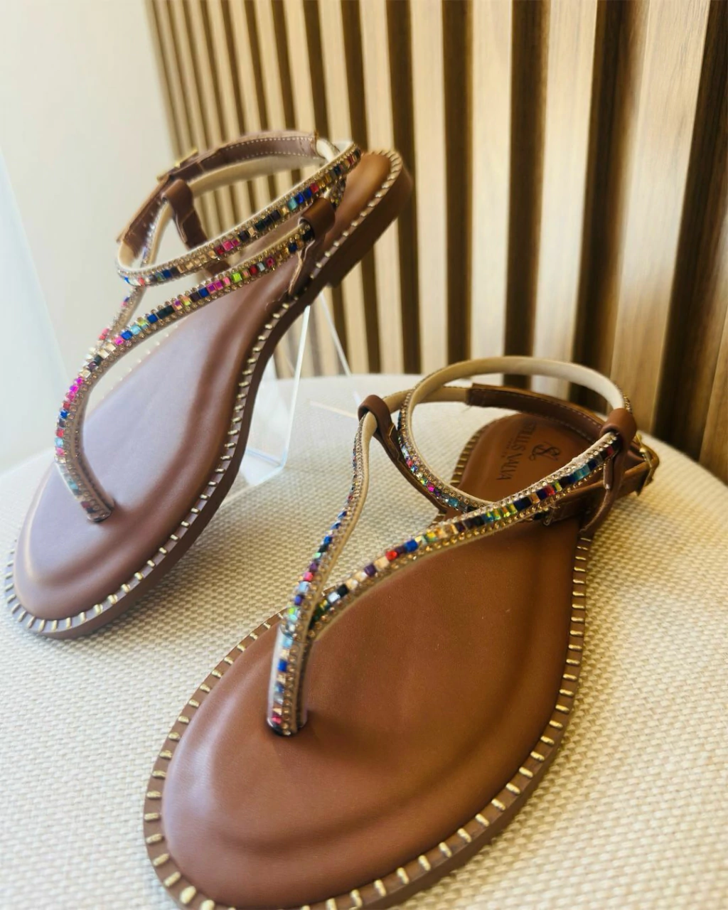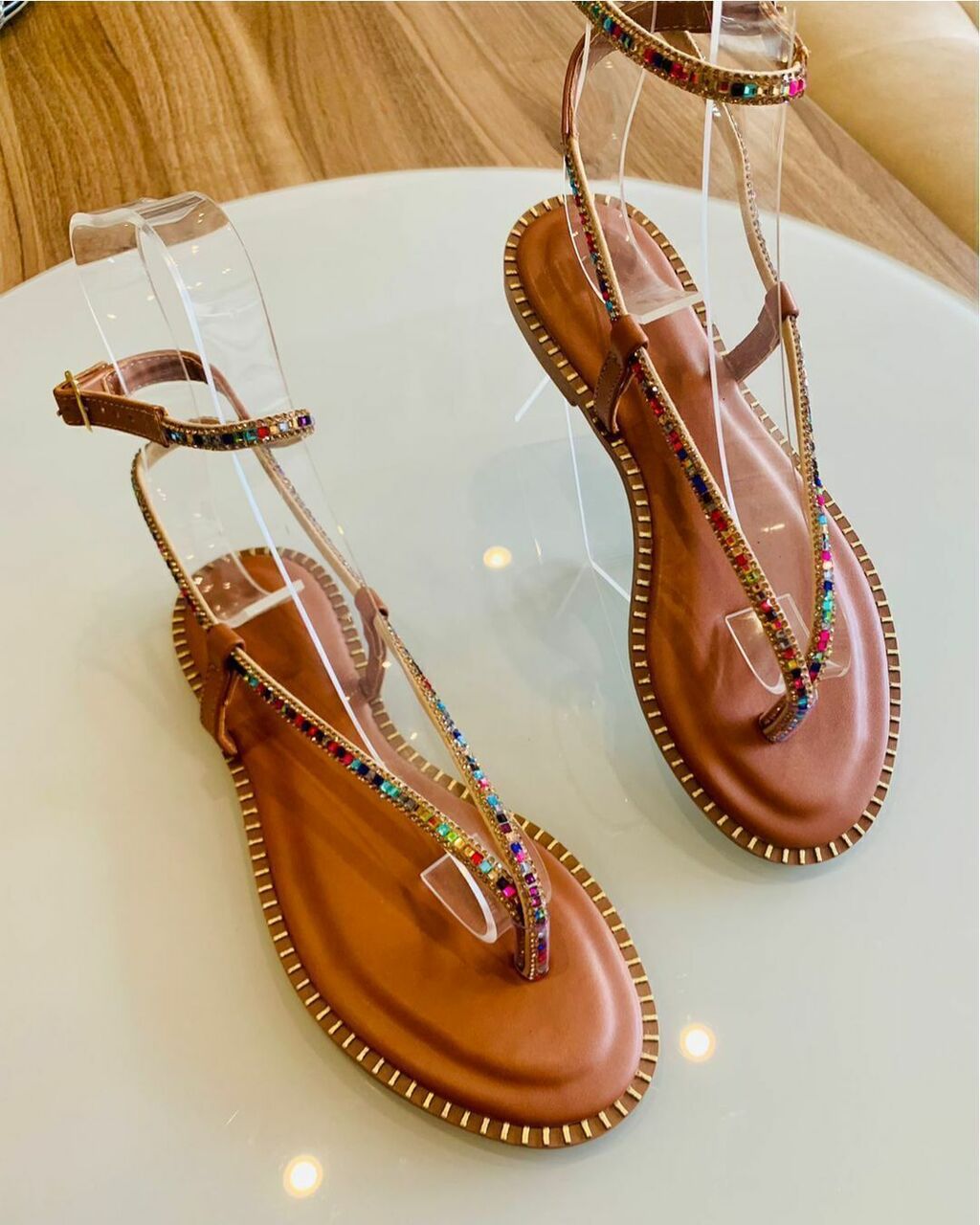 Rasteira com Tiras de Strass Caramelo: a combinação perfeita de elegância e conforto. Ideal para quem deseja adicionar um toque sofisticado ao seu visual, essa rasteira é perfeita para o dia a dia e também para ocasiões especiais.
