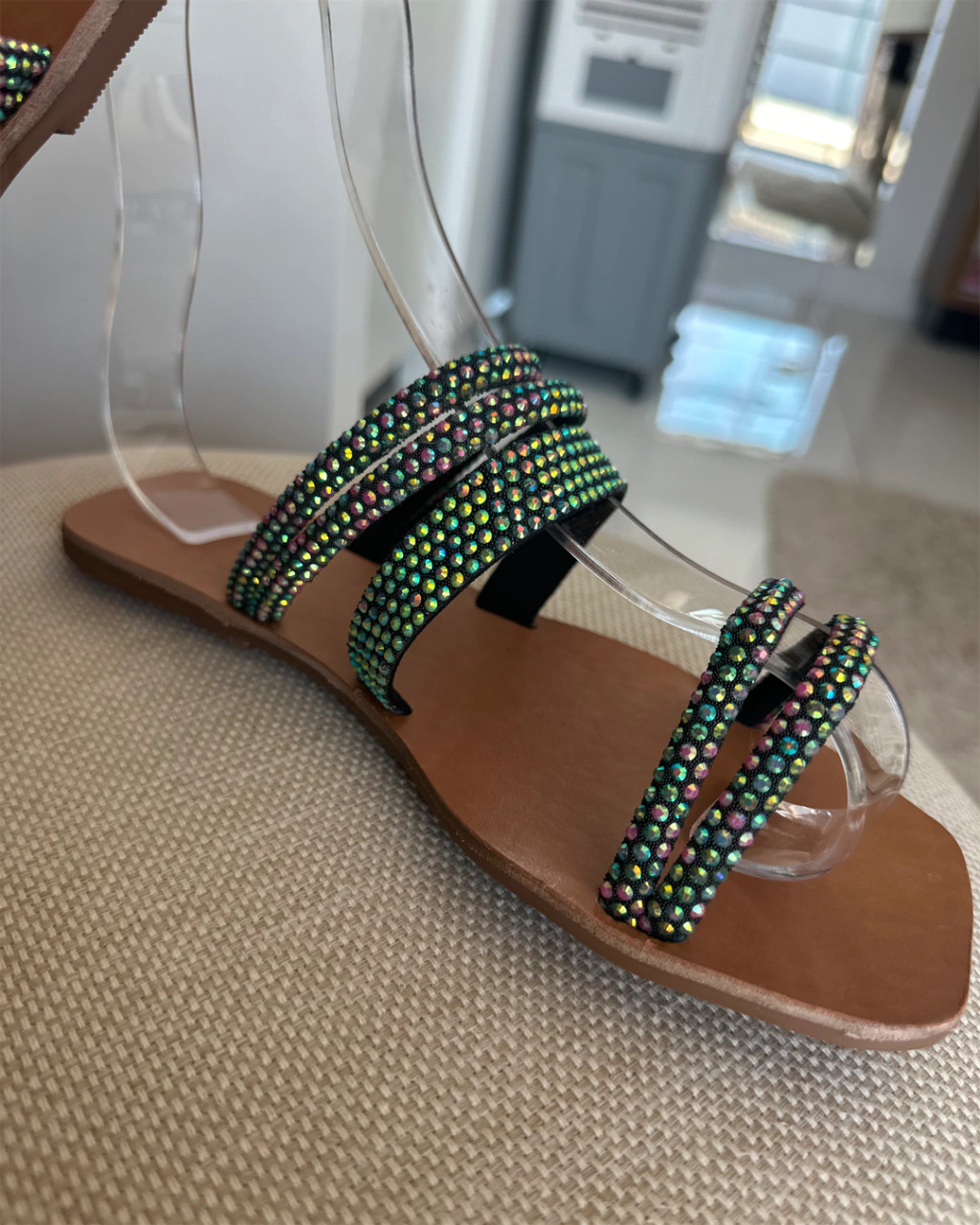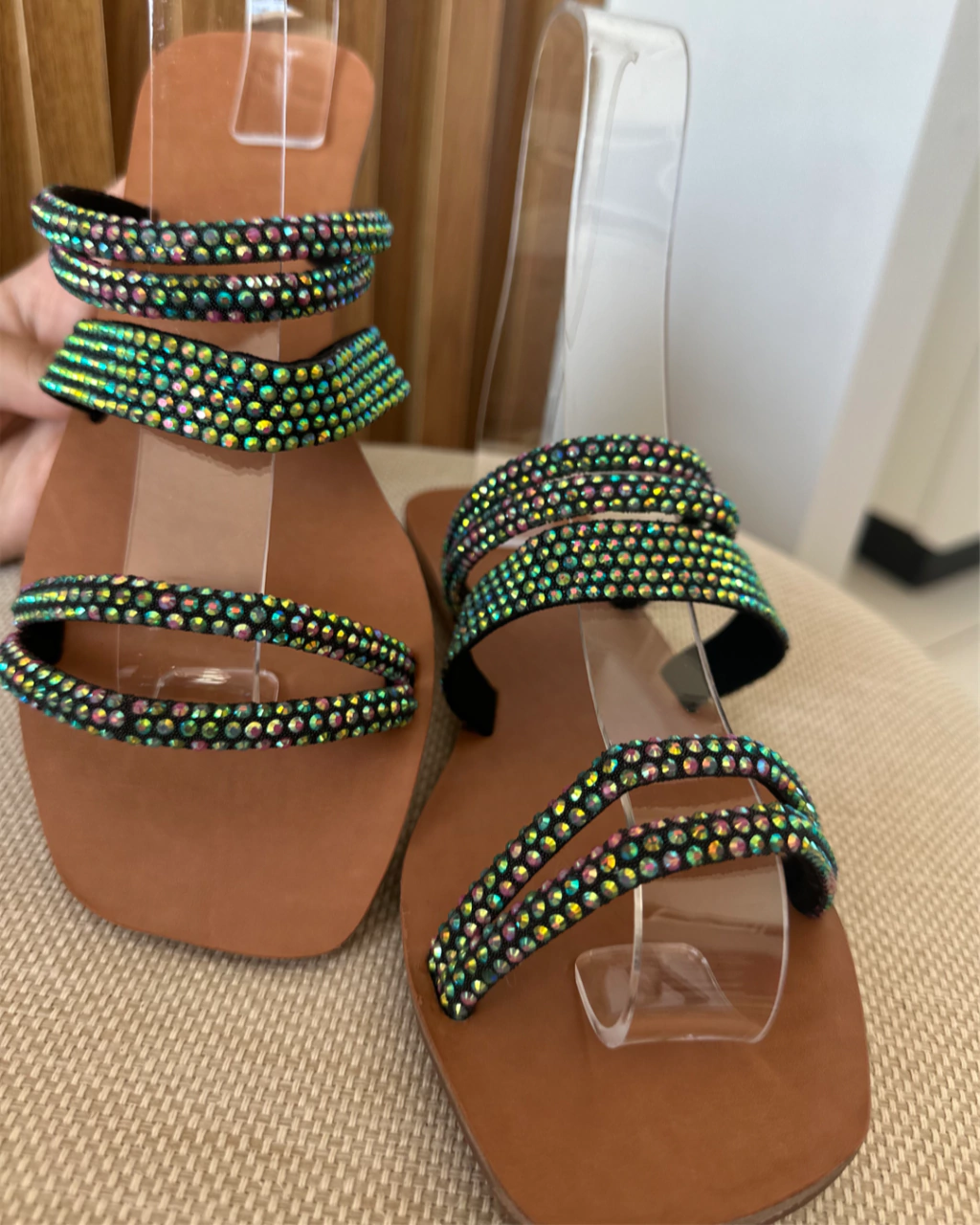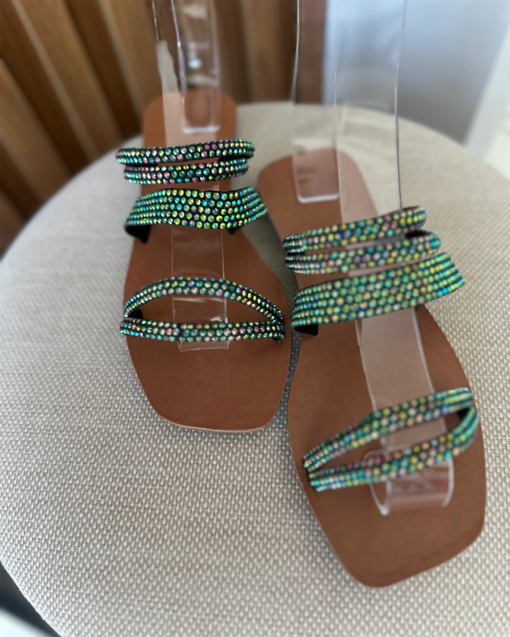 Tiras: Finas e delicadas, decoradas com strass verde para um toque sofisticado