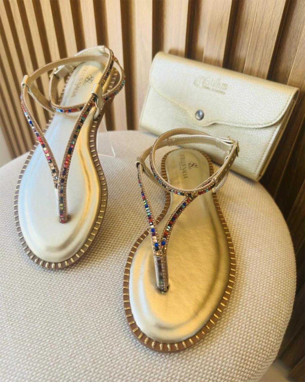 Rasteira com Tiras de Strass Ouro: a combinação perfeita de elegância e conforto. Ideal para quem deseja adicionar um toque sofisticado ao seu visual, essa rasteira é perfeita para o dia a dia e também para ocasiões especiais.