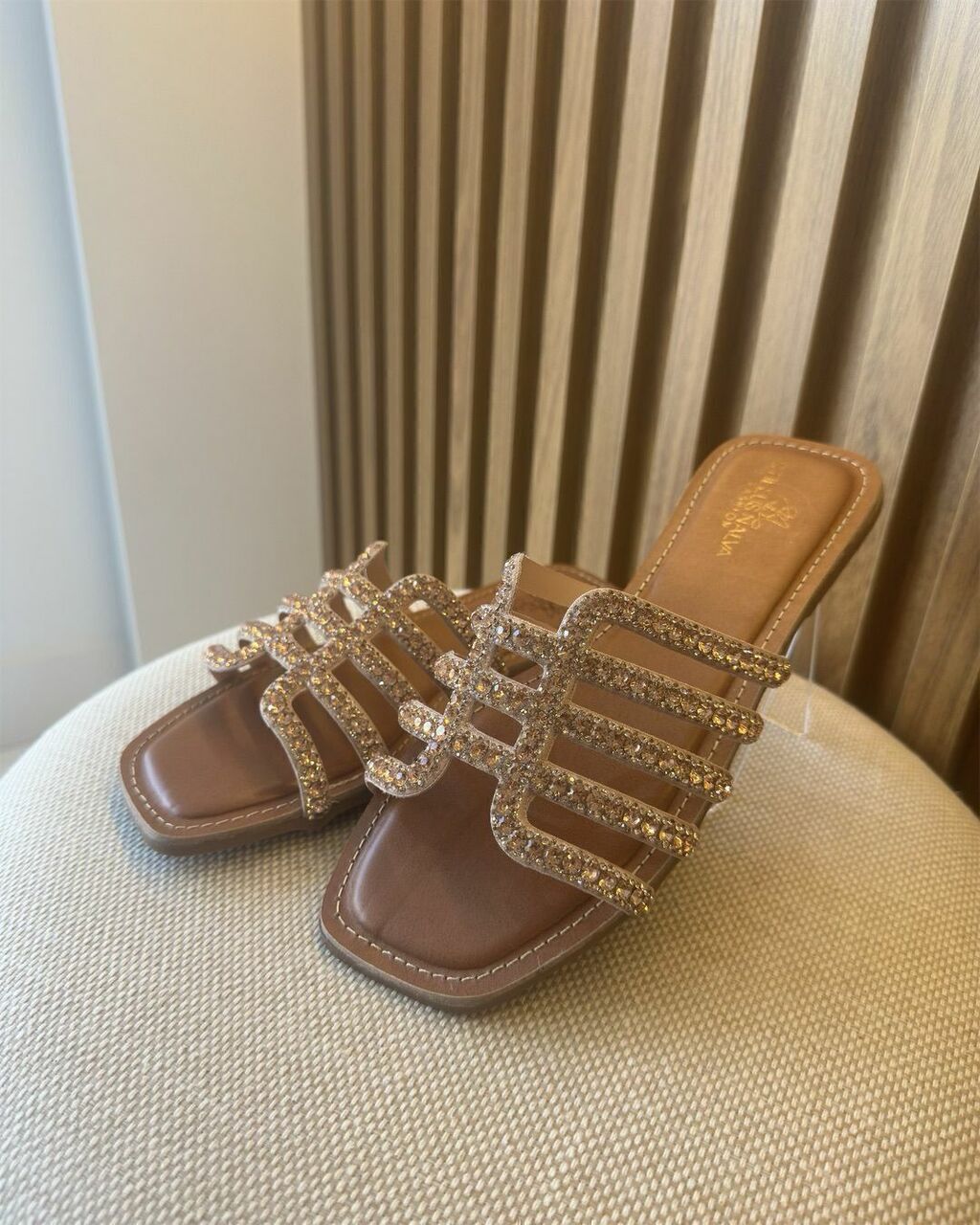 Rasteira Sofia com Tiras de Strass Marrom: a combinação perfeita de elegância e conforto. Ideal para quem deseja adicionar um toque sofisticado ao seu visual, essa rasteira é perfeita para o dia a dia e também para ocasiões especiais.