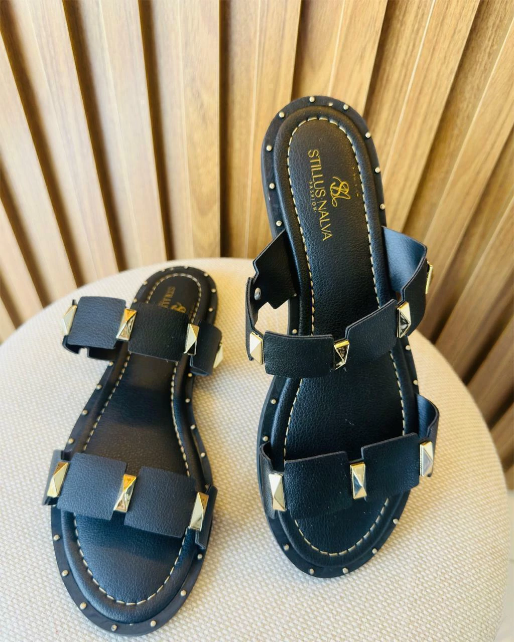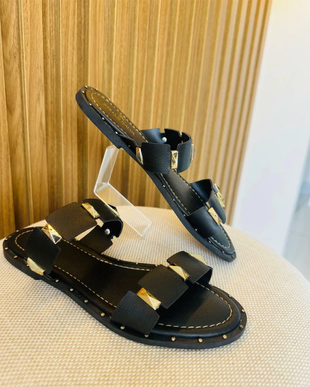 Sandália Rasteira Raquel Dias Preta, moderna e cheia de atitude, com aplicação de spikes para um toque de estilo e personalidade. Confortável e versátil, é ideal para compor looks despojados ou sofisticados. Perfeita para quem busca elegância e conforto no dia a dia.