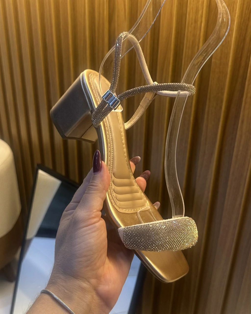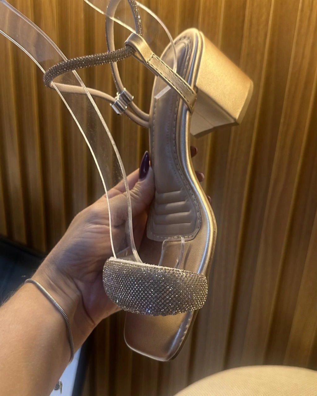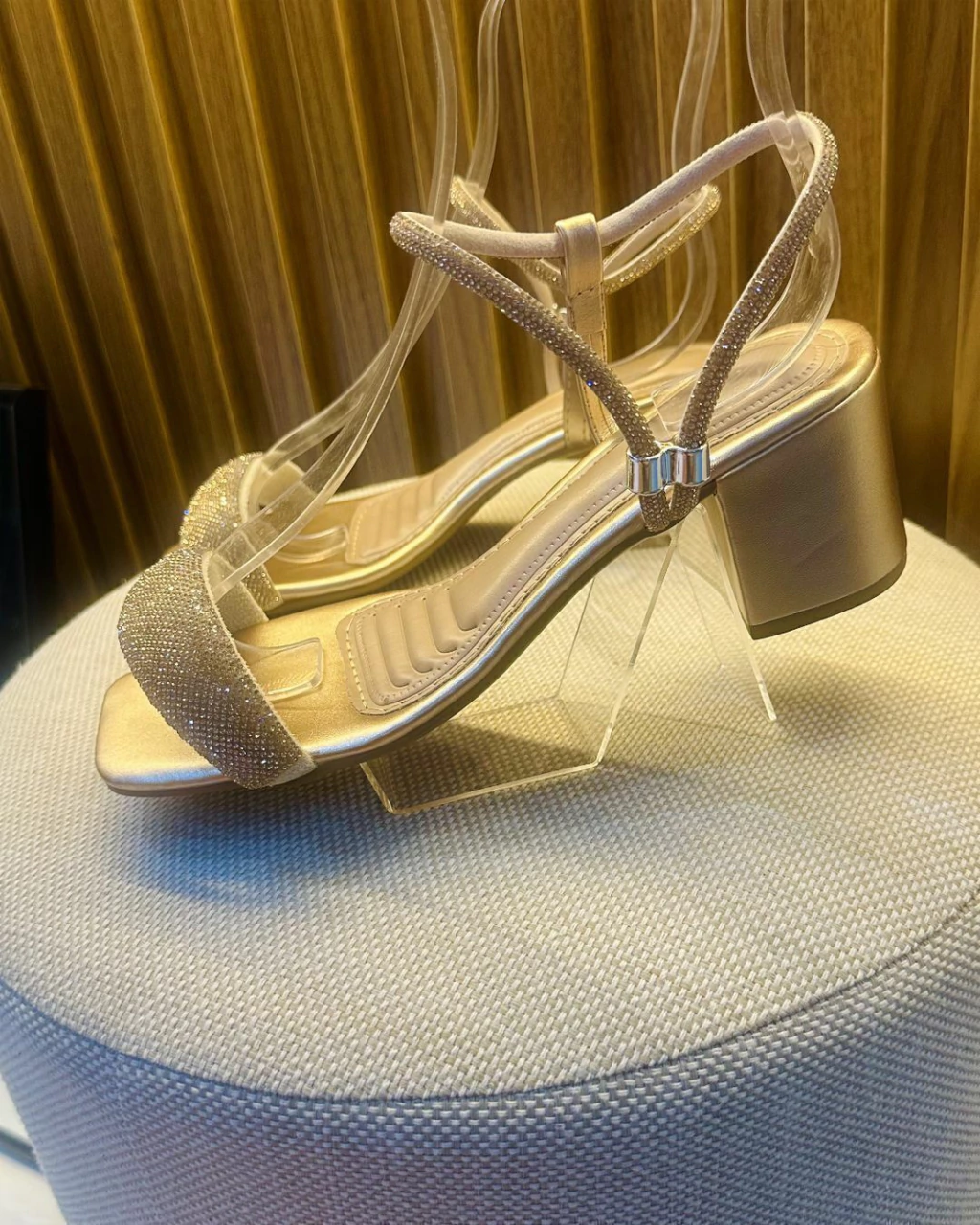 Deslumbrante e confortável, esta sandália de salto bloco de 6,5 cm na cor dourada combina elegância com praticidade. As tiras finas com aplicação de strass no peito do pé destacam o visual com um brilho discreto e sofisticado. Com ajuste lateral flexível, você pode usar a sandália de duas maneiras diferentes, adaptando-se ao estilo da ocasião. A palmilha acolchoada garante um calce macio e prazeroso, perfeito para quem deseja caminhar com estilo e conforto.