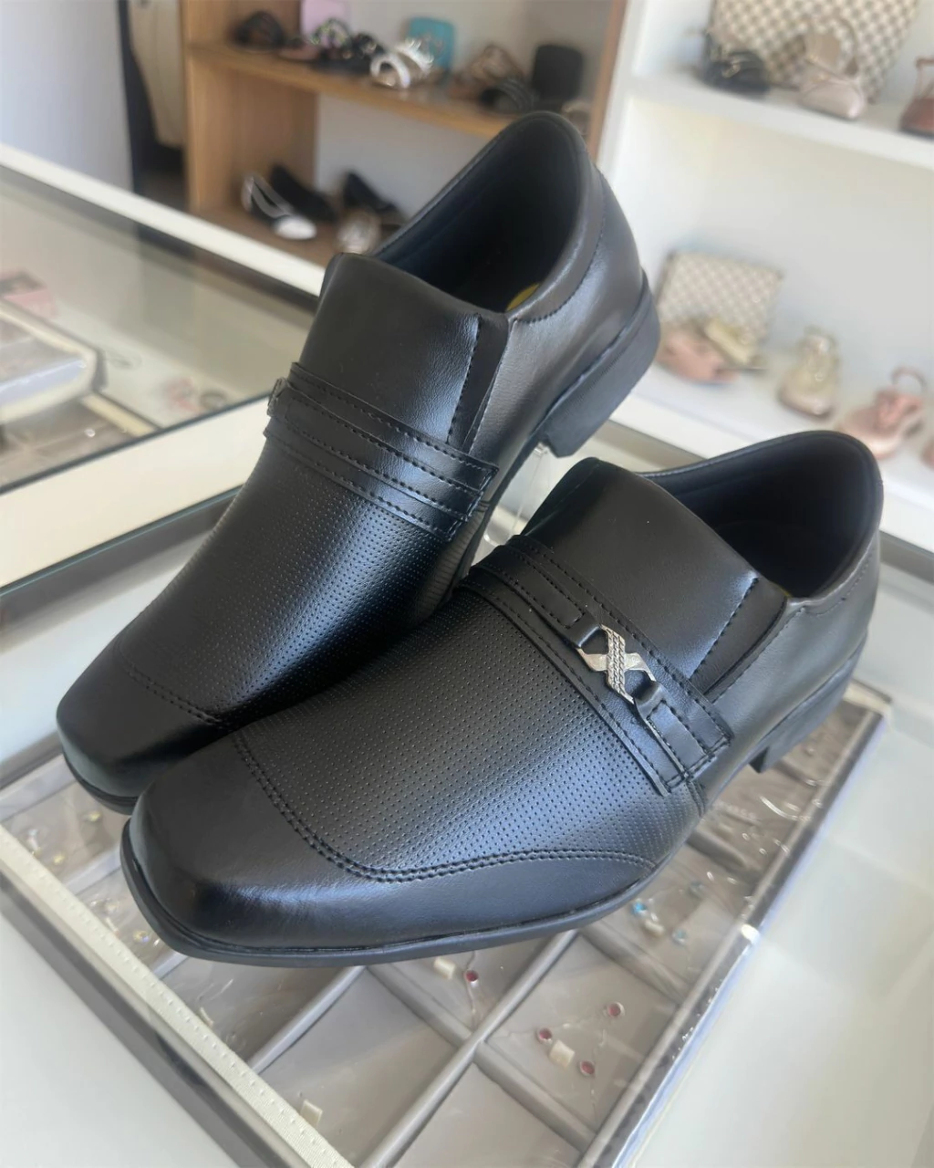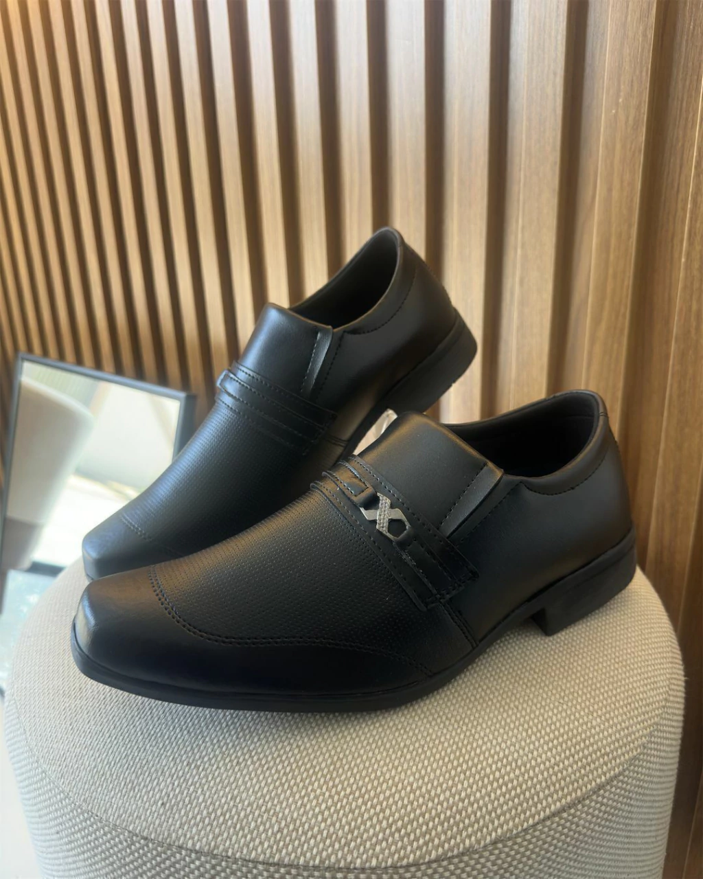 Design Clássico: Com acabamento em couro sintético preto de alta qualidade, este sapato oferece um visual elegante e atemporal que complementa qualquer traje social.