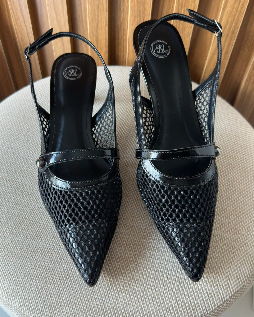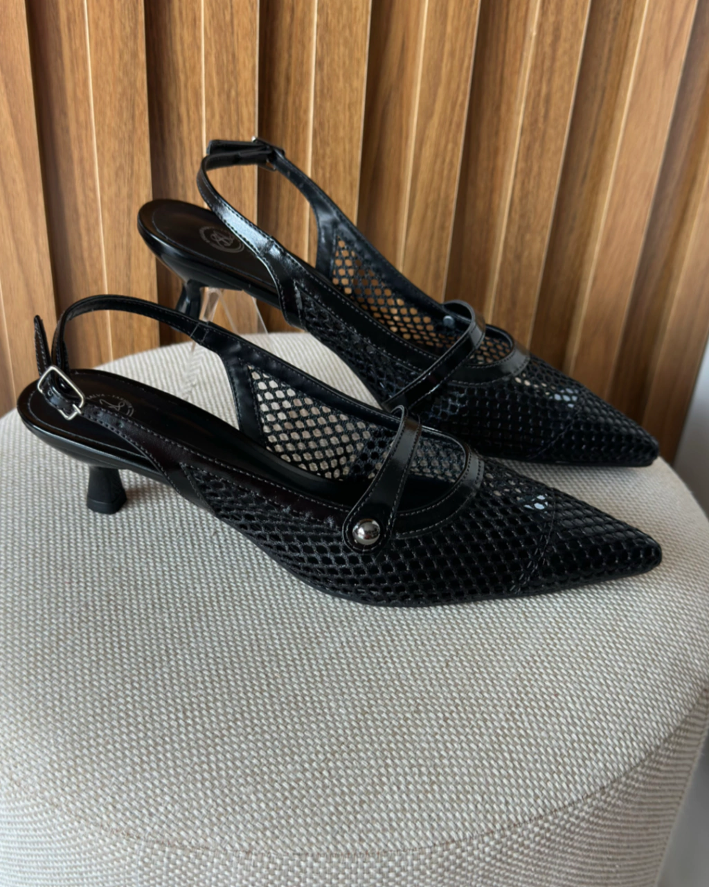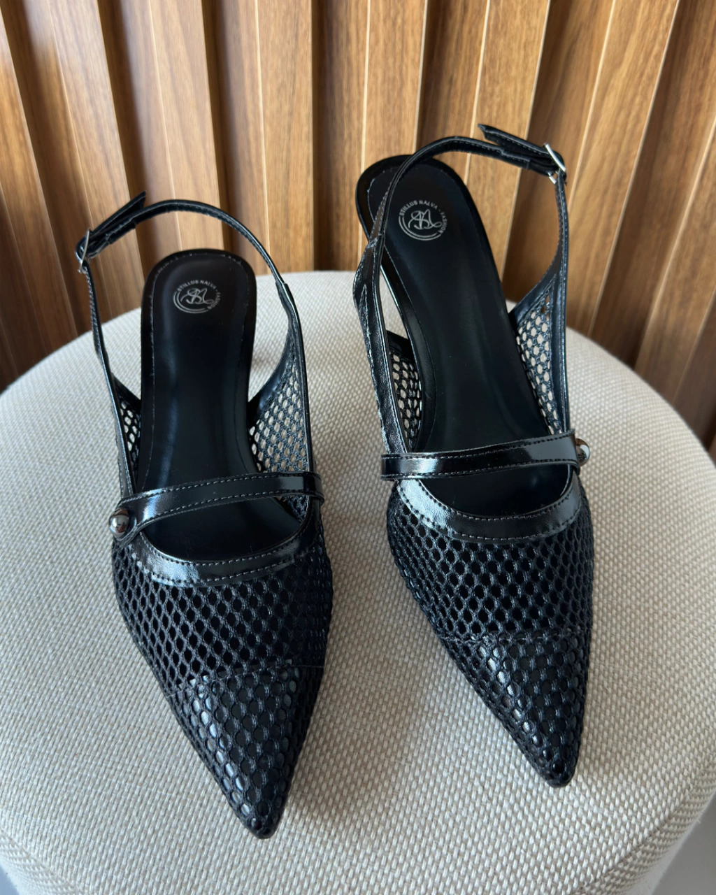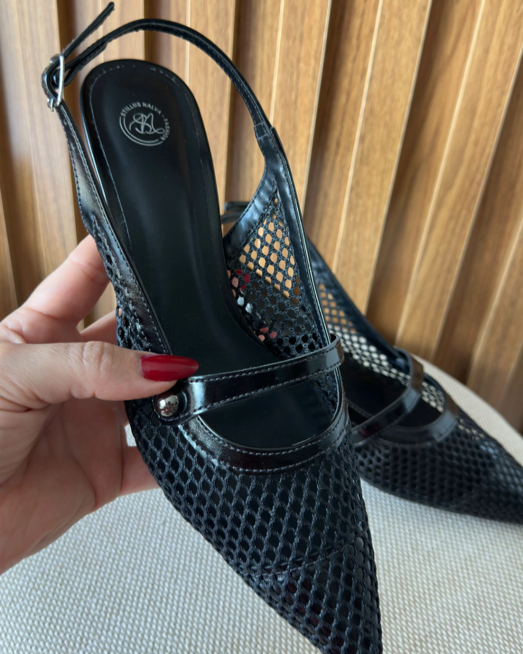 O fechamento traseiro proporciona encaixe perfeito, realçado por um delicado detalhe no peito do pé que acrescenta charme extra. O acabamento em tela com prime preto metalizado adiciona leveza, respirabilidade e um brilho sutil, ideal para dias quentes ou eventos que pedem conforto sem perder a elegância.