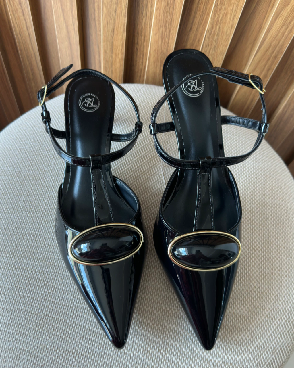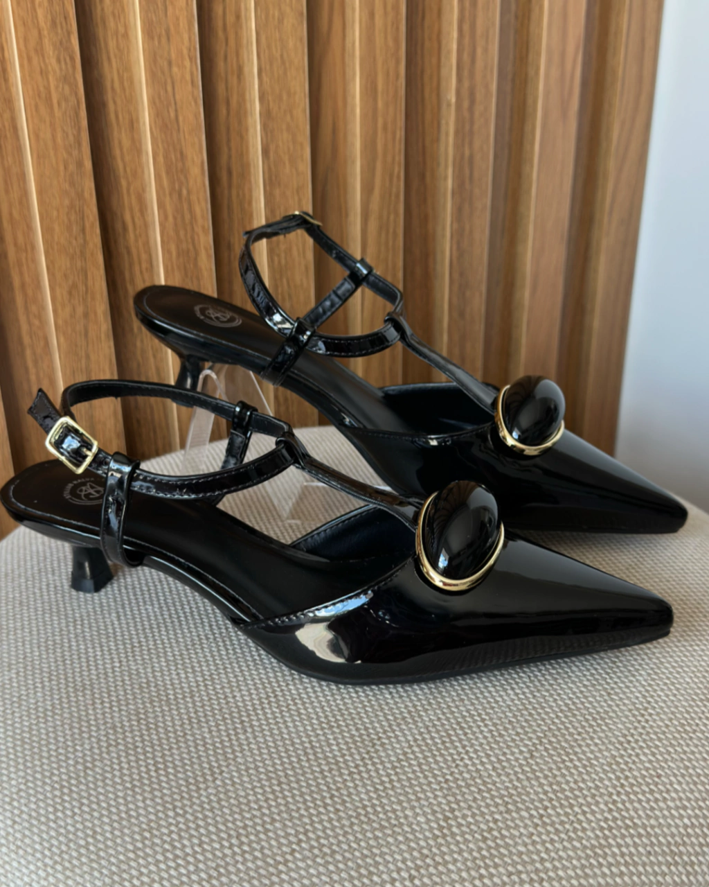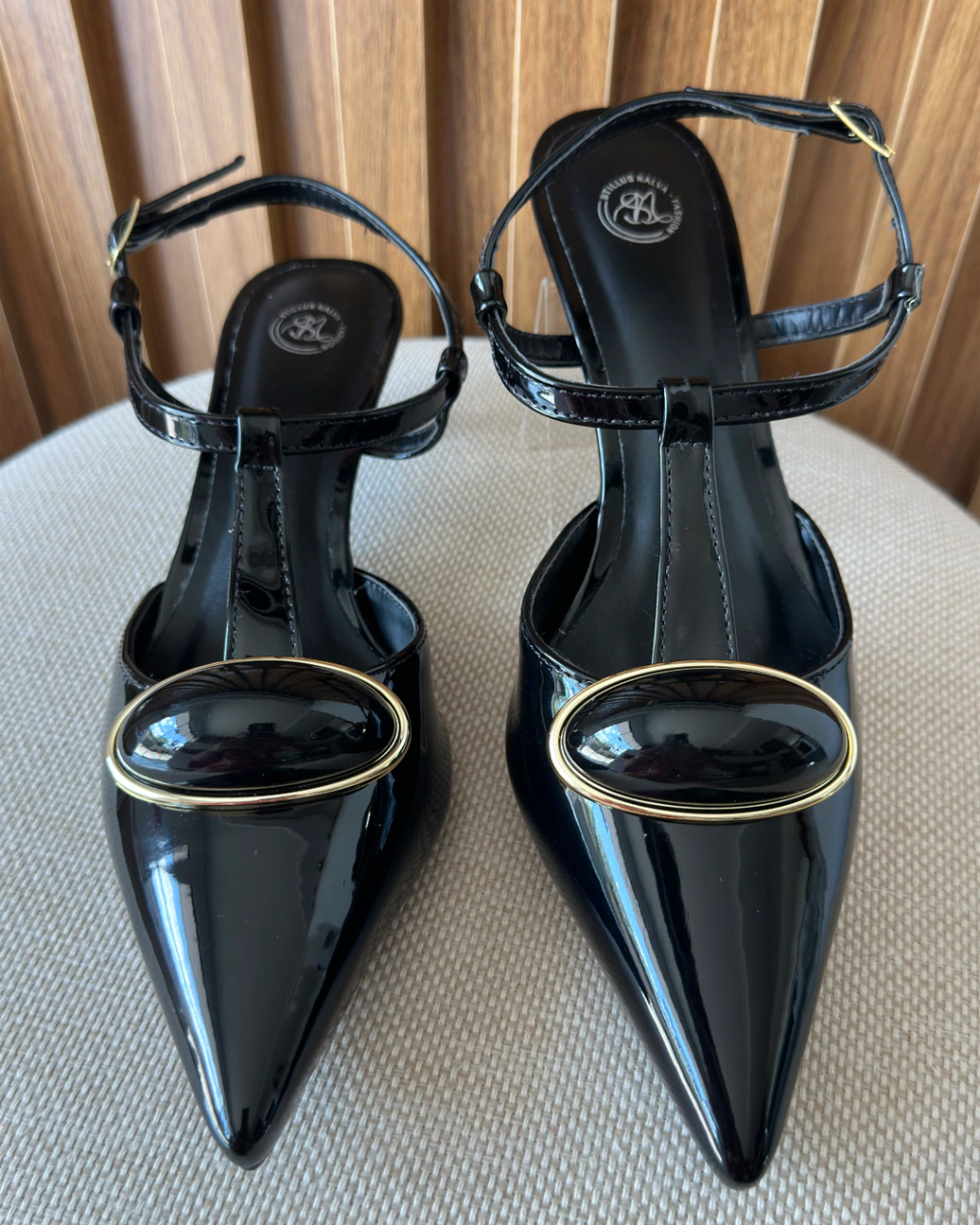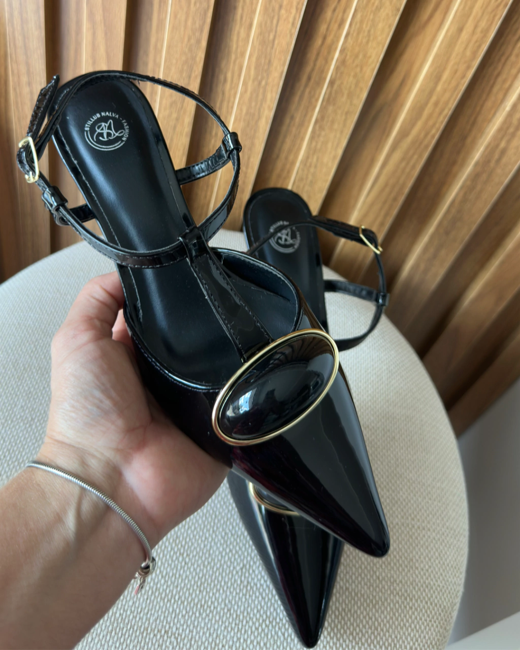 Com acabamento em verniz Preto, este scarpin slingback une sofisticação e versatilidade em cada detalhe. O bico fino acrescenta um toque moderno e exclusivo, enquanto o aplique frontal em pedra Preta com delicadas bordas douradas valoriza o modelo, trazendo ainda mais charme, brilho e requinte.