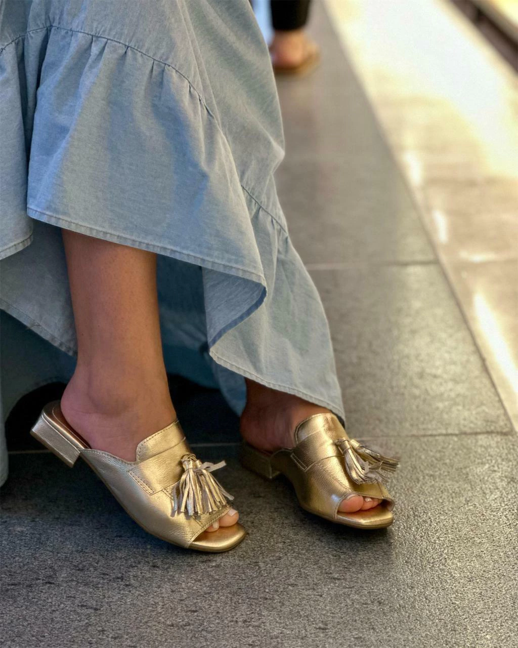 Além disso, a estrutura do tamanco prioriza o bem-estar dos pés, com uma palmilha macia e um solado resistente, proporcionando segurança ao caminhar. Seu tom champanhe agrega um toque refinado e discreto, permitindo combinações harmoniosas com diferentes estilos de roupa.