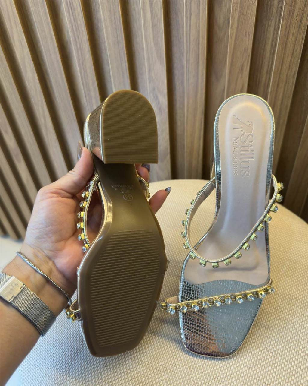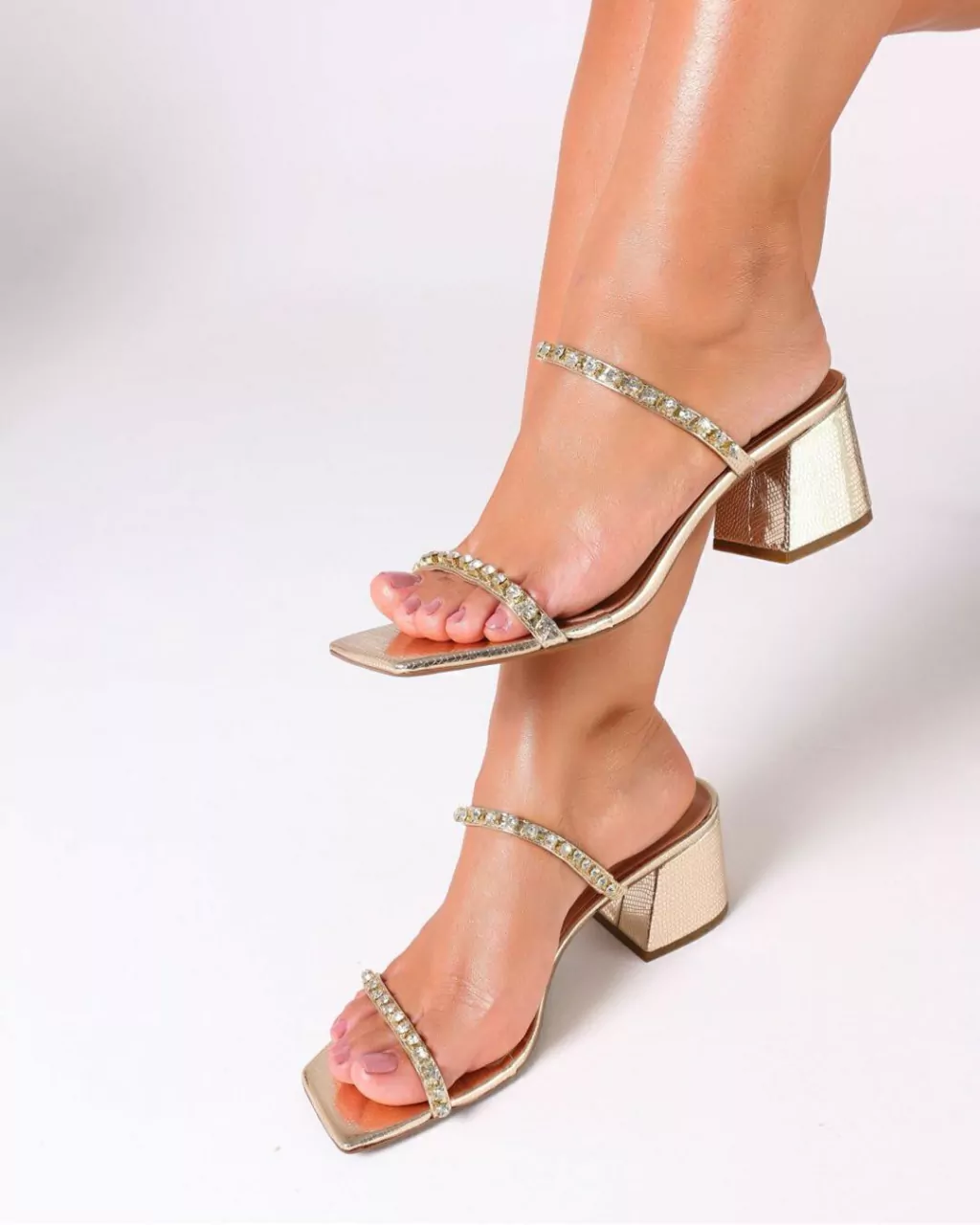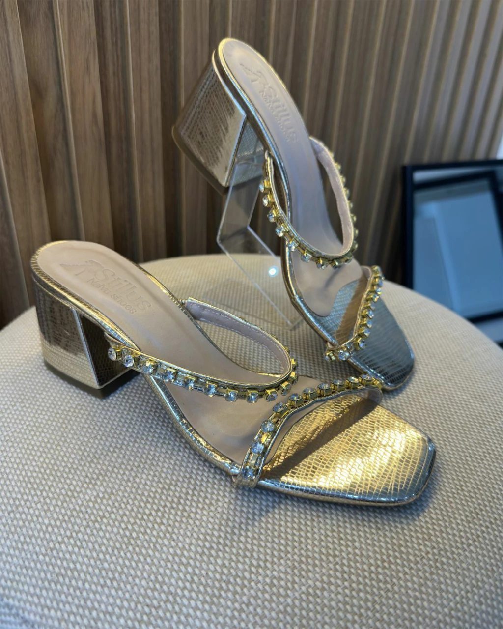 CONFORTO E LEVEZA: O Tamanco Lara Dourado cheio de estilo e conforto nessa nova forma em tamanco com strass nas correias, a combinação contemporâneo e comodidade para os pés.